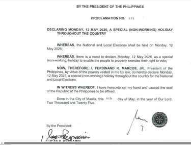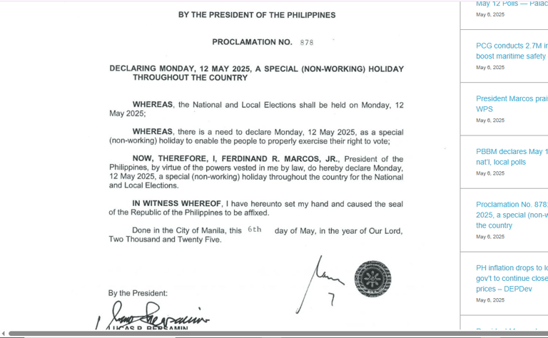 Nilagdaan ni Pangulong Marcos ang Proclamation No. 878 ngayong araw, May 6, 2025 na nagdedeklara sa Araw ng Eleksyon, May 12 bilang special (non-working) holiday. Ang araw ng eleksyon ay araw ng Lunes kung saan karamihan ng voters ay mga trabahante. Ayon sa nilagdaang Proklamasyon, ang pagdeklara ay kinakailangan upang mabigyang pagkakataon ang mga mamamayang Pilipino na magawa ang tungkulin at karapatang bumoto.