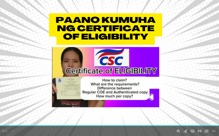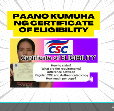 Ang Certificate of Eligibility ay ibinibigay sa mga Career Service Exam passers o mas kilala bilang Civil Service Exam sa Pilipinas. Ito ay nagpapatunay na ikaw ay eligible na para mag-apply sa mga posisyon sa gobyerno. Basahin ang article na ito for more information kung paano mag-apply sa Civil Service Exam https://janicedeherce.com/paano-mag-apply-sa-civil-service-exam2025