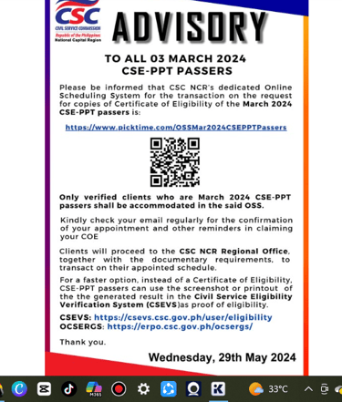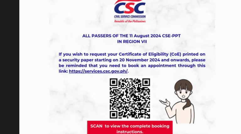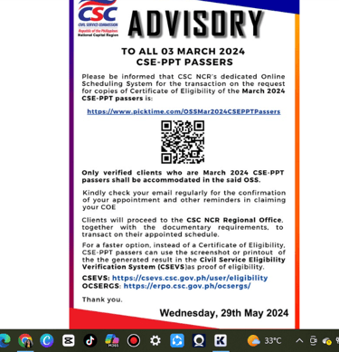 Kung walang update o announcement sa FB PAGE, tingnan kung makikita mo ang inyong region sa CSC E-SERVE website kung saan ka makakapag book ng appointment . Mas mabuti na kontakin muna sila para siguradong available na ang inyong Certificate lalo na kung kaka exam mo lang.
